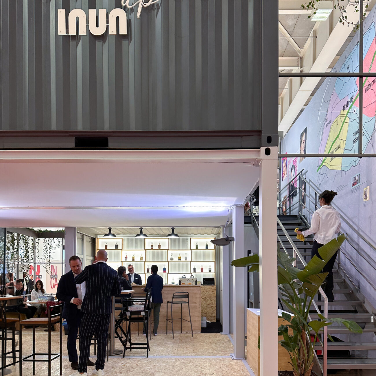 Struttura a due piani composta da quattro moduli container e due piattaforme pavimento, scala e parapetti.